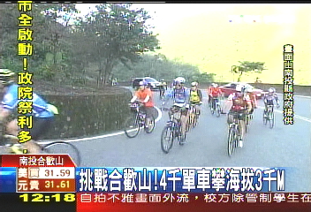 據臺灣TVBS報道,4000多輛自行車挑戰合歡山,出了市區,上山路全是難關。合歡山公路超大斜坡,開車的只要輕踩油門,但這些自行車騎士踩踏板的頻率已經像在跑步,卻只能緩慢爬升。
