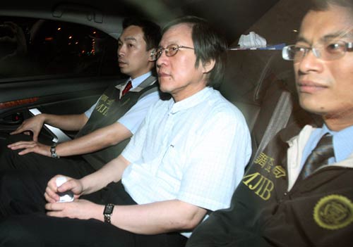 特偵組30日晚間傳喚臺當局前“國安會秘書長”邱義仁(中)及5名證人到案。檢察官偵訊后認為邱義仁涉嫌利用職務詐取財物罪嫌,于31日凌晨將邱義仁移送法院聲請羈押禁見。臺北法院審理后裁準,邱義仁坐進囚車,被送往臺? onkeypress=