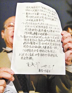 律師展示吳淑珍發表三點聲明的親筆簽名。