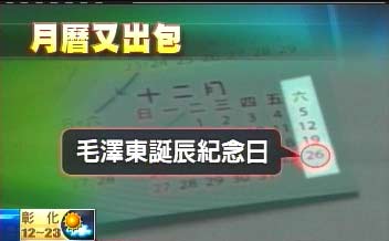 這份2009年的月歷,仔細(xì)看,10月1日是大陸的國慶節(jié),這月歷卡又用紅色特別標(biāo)示,此外,12月這一排星期六都是黑色字體,偏偏26日“紅通通”,一查,這可是毛澤東誕辰紀(jì)念日,但這回發(fā)生在臺涉外部門東部辦事處。