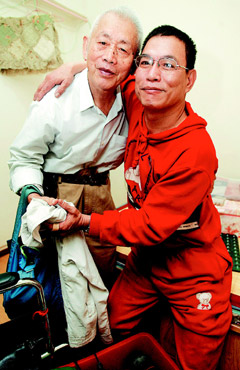 提著藍(lán)色布包,87歲的胡偉昨天早上搭著公交車來(lái)到中山女高校門口,加入善愿愛(ài)心協(xié)會(huì)志工的行列,這是他七年多來(lái)每周日例行活動(dòng),風(fēng)雨無(wú)阻。他是協(xié)會(huì)“國(guó)寶級(jí)”志工,因年歲大行動(dòng)較為緩慢,昨天他一如往常與其它志工前往受助人家中,駝著背將捐出的1000元善款交到小他26歲的身障者蔡行展手里。