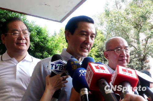 中國國民黨黨主席與黨代表選舉7月26日舉行,馬英九在現任黨主席吳伯雄、競選總干事曾永權陪同下到臺北市興隆路一處投開票所投票。圖為馬英九投票后接受記者采訪。 中新社發 劉舒凌 攝