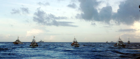 臺灣保釣人士以海釣船前往釣魚島宣示“主權”,十六日清晨當保釣船只接近釣魚島海域時,臺灣巡防艇(前)與日本保安廳巡邏艇(后)相互對峙,不讓日本船只接近保釣船,空中還有日本直升機沿途監視。整個釣魚島海域布滿雙方海防艦艇,情形緊張中相互又頗節制。“中央社”圖