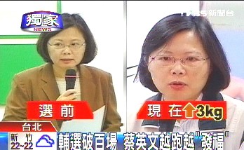 中新網11月27日電 據臺灣TVBS報道,臺灣縣市長選舉進入最后沖刺階段,民進黨選前2個月倉卒提名候選人,準備時間短,拼命跑攤拜票,結果都皮膚曬黑,明顯瘦了一大圈。不過民進黨主席蔡英文體重卻“逆勢成長”,一個月輔選行程破百場,卻可以“心寬體胖”,增加3公斤。