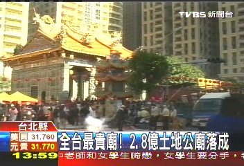 中新網1月19日電 據臺灣TVBS報道,臺北縣的深丘福德宮,因為蓋在黃金地段的新板特區,以2年前一平米200萬(新臺幣 下同)的地價計算,這間土地公廟地價已經高達2.8億,號稱是全臺最貴的廟。之前因為采購法遲遲無法完工,最近終于蓋好了,上午舉行安座大典,神明搬新家,場面相當熱鬧。