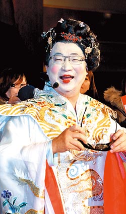 為宣傳張藝謀鳥巢版歌劇圖蘭朵公主,臺中市長胡志強粉墨登場男扮女裝。圖片來源:中國時報