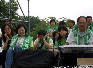 至于謝長廷,也因?yàn)榫癫粷?jì),先到后臺(tái)稍做休息,而靜坐舞臺(tái)上,僅剩黨主席蔡英文和游錫堃率領(lǐng)部分黨公職坐在臺(tái)上,聽著新聞關(guān)心時(shí)事。此外,現(xiàn)場也可發(fā)現(xiàn),部分“立委”因靜坐一宿,體力已超出負(fù)荷,紛紛在舞臺(tái)上打起瞌睡,有的人甚至悄悄地消失不見了。