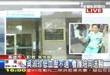 根據(jù)醫(yī)護(hù)人員初步檢查,吳淑珍疑似因?yàn)檫^(guò)度勞累而出現(xiàn)血壓過(guò)低的情況,住進(jìn)醫(yī)院VIP病房,將接受主治醫(yī)生進(jìn)一步的詳細(xì)檢查。