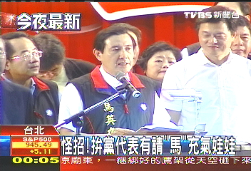 中新網7月21日電 據臺灣TVBS報道,馬英九參選國民黨主席,20日晚到臺北縣造勢,有2位民眾激動陳情,還有許多競爭黨代表的候選人借機賣力造勢,有人打造吉祥物,有人居然拿出男性充氣娃娃,臉部畫成馬英九搶鏡頭。