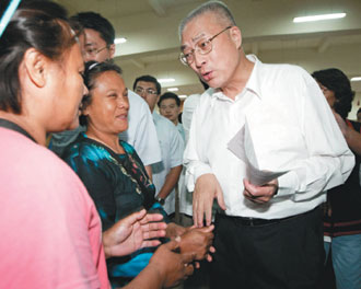 昨晚八時(shí)二十分,吳敦義與“副院長(zhǎng)”朱立倫、“秘書長(zhǎng)”林中森等官員,在高雄縣長(zhǎng)楊秋興陪同下,抵達(dá)陸軍官校禮堂,與收容在校內(nèi)的桃源鄉(xiāng)災(zāi)民座談,聽取災(zāi)民心聲。