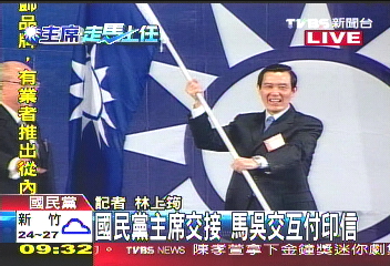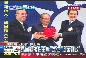 馬英九從吳伯雄手中接過黨主席印信。(臺灣TVBS圖)