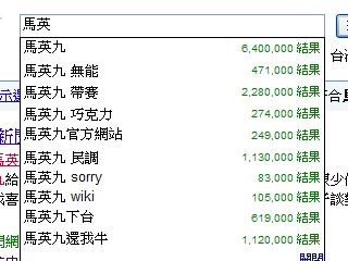 記者實際在Google上網搜尋,以馬英九為例,才打上“馬英”二個字,Google搜尋網頁上赫然自動跳出“馬英九,無能”,或是“馬英九,帶賽”等搜尋建議條件;在雅虎奇摩進行同樣搜尋時,則有十項搜尋建議產生,但無“無能”或“帶賽”的搜尋建議。