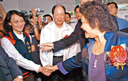 黃昭順、侯彩鳳“立委”先到陪著吳敦義,后來趕到的陳菊與吳敦義握手后,接著主動(dòng)與黃昭順握手并稱“黃委員”,黃則回以微笑。