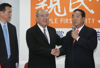 中新網11月19日電 親民黨主席宋楚瑜與國民黨主席吳伯雄今天(19日)共同召開記者會,宣布親民黨“立委”馮定國退出區域“立委”選舉。但黨籍“立委”沈智慧等仍不愿退選,宋楚瑜表示,明天為“中選會”受理“立委”參選人登記最后一天,國親一定努力整合到最后一刻,不放棄任何機會。