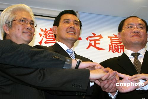 馬英九(中)與其辯護律師將手緊緊搭在一起。中新社發 董會峰 攝