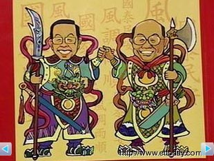原本農(nóng)歷上的門(mén)神變成了謝長(zhǎng)廷與蘇貞昌兩人的卡通造型,底下一行“長(zhǎng)”治久安,更是意有所指。