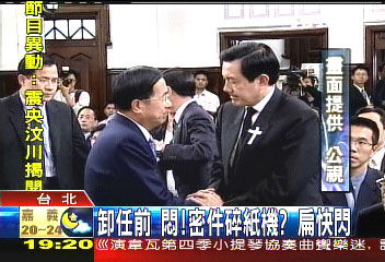 中新網(wǎng)5月15日電 5月20日臺灣當局將進行權力交接。即將卸任的陳水扁和就要接棒的馬英九,14日在柏楊追思會上相遇。陳水扁與馬英九碰頭后,兩人除了進出場兩度握手后,沒有其它互動。