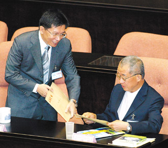 臺“立法院”1日審查“監察院正副院長”被提名人資格,圖為“監察院長”被提名人王建煊(右)、“副院長”被提名人沈富雄(左)。 臺灣聯合報圖