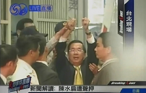 11月11日,臺(tái)檢方偵辦機(jī)要費(fèi)案及陳水扁家庭疑洗錢案,今天上午第五度以被告身份傳喚陳水扁到案說(shuō)明。經(jīng)過(guò)6個(gè)多小時(shí)的偵訊后,陳水扁被檢方聲請(qǐng)羈押禁見(jiàn),并銬上手銬,移送到臺(tái)北地方法院開(kāi)羈押庭,等待法官裁決是否要收押。圖片來(lái)源:電視截圖