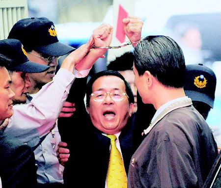 進(jìn)入特偵組7個(gè)小時(shí)后,特偵組以海外洗錢案、“機(jī)要費(fèi)”貪腐案涉嫌貪污、收賄等四項(xiàng)罪名,正式向臺(tái)北地方法院聲請(qǐng)收押陳水扁。下午4時(shí)20分,陳水扁步出特偵組,來(lái)了一個(gè)“最后政治秀”。他墊起腳尖,高舉銬著手銬的雙手長(zhǎng)達(dá)17秒,高喊“政治迫害”“司法冤獄”“臺(tái)灣加油”等口號(hào),“從容就義”登上警車。