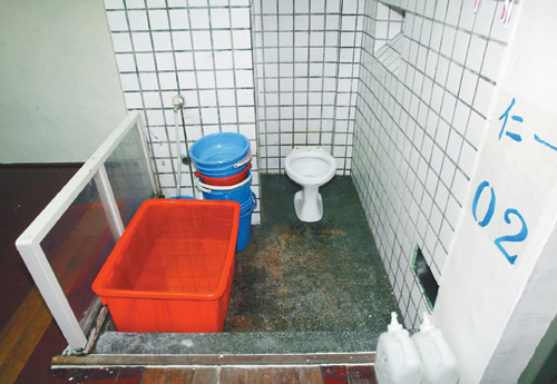 房舍中浴室兼廁所,陳水扁只能蹲著洗澡。圖片來源:臺灣《聯合報》