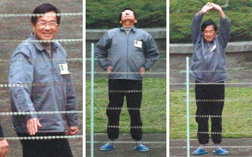 接著扁開始抬腿、散步暖身,還向記者打招呼,然后扁開始抬膝蓋、雙手上下左右伸展;扁雙手向上舉時一度停了一分半鐘,還臉帶笑意朝記者望去,似乎故意要擺給記者看。