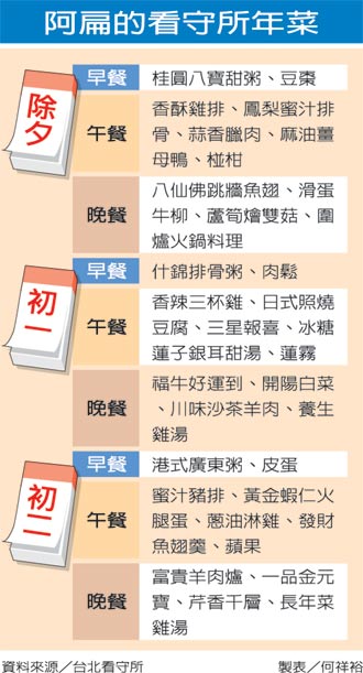 至于前東森集團總裁王令麟因為茹素,北所有準備素食收容人菜單,年夜飯也有糖醋鳳梨、炒三絲及蘆筍燴雙菇。