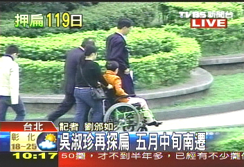 中新網4月27日電 據臺灣TVBS報道,陳水扁妻子吳淑珍傳出在5月20日以前,就要南遷到高雄新家,今天(27日)兒子陳致中也特別北上,和吳淑珍一起探望陳水扁。