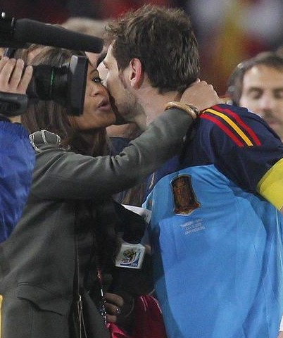 比賽結束后,身為體育主播的卡西美艷女友自然要采訪西班牙的功臣,訪談結束后,她在眾目睽睽之下現場為圣卡西送上香吻。