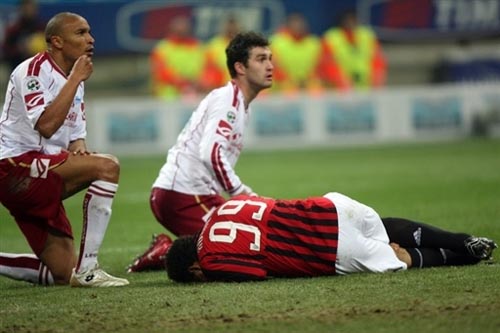 本場比賽進(jìn)行到57分鐘時,AC米蘭0比1落后對手。對鋒線上的搭檔帕洛斯基和吉拉迪諾不滿的主教練安切洛蒂換上了羅納爾多和因扎吉。第60分鐘,奧多右路起球,沃諾隊隊的防守球員維迪加爾手球,主裁判吹罰點球并向維迪加爾亮出黃牌。羅納爾多因試圖跳起來攔截奧多的傳球受傷,抱著左膝倒地,表情痛苦地以手掩面,隨即哭著被擔(dān)架抬下直接送往更衣室。