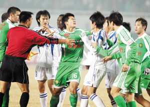 在補(bǔ)時了長達(dá)7分鐘后,主裁判阿卜杜拉終于吹響了終場結(jié)束的哨音,但裁判的3聲長哨卻變?yōu)椤皼_鋒號”,兩隊隊員再次糾纏到一起,最后北京警方不得不進(jìn)入場內(nèi)控制局面,才讓怒火中燒的兩隊球員返回各自休息室。