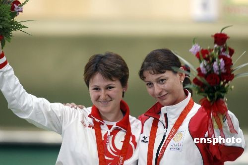 8月10日,北京奧運會女子10米氣手槍決賽在北京射擊館落下帷幕,中國選手郭文珺以492.3環勇奪金牌,俄羅斯選手納塔利婭·帕杰林娜總分489.1環位列第二獲得銀牌,格魯吉亞老將妮諾·薩盧克瓦澤以487.4環的成績奪得銅牌。 圖為帕杰林娜(左)與薩盧克瓦澤在領獎臺上親密合影。 ? onkeypress=