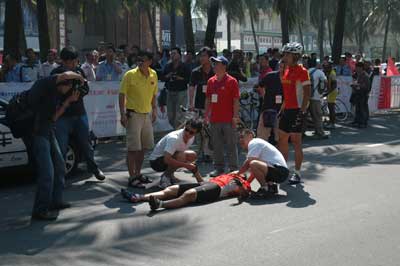 昨天,由海馬汽車贊助的2007環(huán)海南島國(guó)際公路自行車賽結(jié)束第三賽段爭(zhēng)奪,雖然本賽段比較平,難度不大,但卻意外發(fā)生中國(guó)隊(duì)選手惠國(guó)與攝影記者碰撞事件。記者昨天采訪了解到,惠國(guó)身體多處擦傷,退出比賽的可能性非常大。