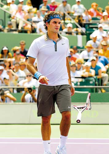 在今晨進行的邁阿密索愛公開賽男單半決賽中,費德勒摔拍了———在決勝盤第3局再次打丟一個機會球后,他將球拍往地上重重一砸、拍子立馬報廢。