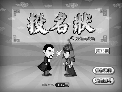 而互動(dòng)惡搞《投名狀》的游戲也很有趣,就是趙二虎發(fā)現(xiàn)自己夫人蓮生和龐青云有染,為了挽回男人的尊嚴(yán),他只有靠武力來證明自己是最強(qiáng)的,請(qǐng)參與游戲者幫趙二虎來挑戰(zhàn)龐青云。而游戲規(guī)則就是使用控制鍵,控制趙二虎挑戰(zhàn)龐青云,在規(guī)定時(shí)間內(nèi)打敗龐青云即告勝利。在熟悉了游戲規(guī)則之后,此類惡搞并無難度系數(shù)。勝者王敗者寇,如果輸了,趙二虎會(huì)慚愧跪地說:“為什么我會(huì)輸?我才是元配。”而龐青云則會(huì)摟著蓮生說:“我是唯一的選擇,請(qǐng)支持壹基金。”結(jié)果令人忍俊不禁。