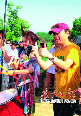據(jù)悉,“五一”期間在成都舉辦的熱波音樂節(jié)是片中一個拍攝場景。從記者獲得的劇照來看,譚維維正率領(lǐng)一群裝扮火辣的鼓手,一邊打鼓一邊起舞,場面動感。而譚維維的造型也是首度曝光,她以一身清涼露臍裝亮相,加上具有民族元素的鮮艷裝飾和文身點綴,更顯火辣。尤其是她的發(fā)型卡通味道濃郁,一縷縷火箭般的沖天直發(fā),十分夸張。