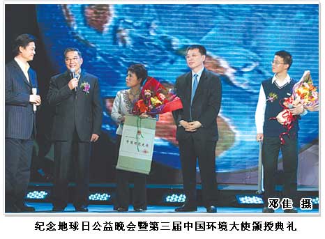 本報4月22日訊 “紀念地球日公益晚會暨第三屆中國環(huán)境大使頒授典禮”今日在京舉行。宋祖英等10人被環(huán)境保護部聘為新一屆“中國環(huán)境大使”。全國政協(xié)副主席李金華、國家發(fā)改委副主任解振華、環(huán)境保護部副部長潘岳等出席頒授典禮。