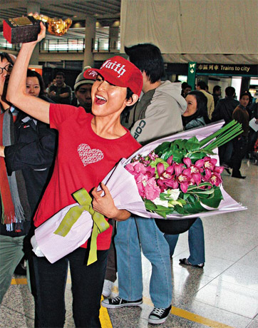 劉美君昨日返港時,獲歌迷獻花,她興奮得拿著金馬獎杯與fans打招呼。