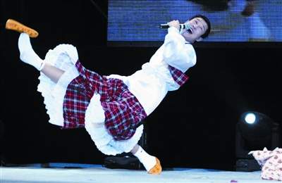經過近2小時的“溫場”后,小沈陽終于壓軸登臺亮相。一看到身穿標志性的紅格子“蘇格蘭”服,背著小挎包的小沈陽從后臺走出來時,觀眾紛紛尖叫著起立。久候在舞臺邊的一群女粉絲手捧鮮花,欲沖過保安防線上前獻給偶像。“對我的粉絲要客氣哦!”小沈陽金口一開,粉絲們立即突破了防線沖上臺去,有女粉絲獻過花后再來一個熊抱,后面的女粉絲更是“搶吻”小沈陽,“陽仔(小沈陽小名)我愛你”的真情表白更在劇場內此起彼伏,看來小沈陽的“女人緣”極好。