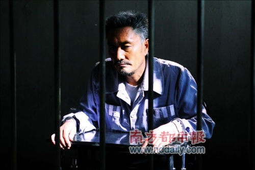 當日的內景拍攝現場是一間不足20平方米的小屋,整間小屋被布置成監獄會見室的樣子。一道監獄的鐵閘將小屋一分為二,鐵閘外是一張小桌,上面放著一杯沖好的茶水和一沓文件,這是律師徐崢會見犯人時所用的桌子。鐵閘里只放著一張輪椅,穿著囚服的多布杰就坐在這張輪椅上與徐崢談話。多布杰的左腿整個小腿部分由支架支撐,據說,這是一條已經被鋸過的假腿。整個囚室都籠罩在一片發藍的光線里,微塵在光里飛舞,有冷感。
