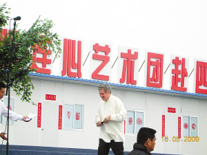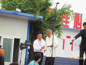 雖然本次“心連心”藝術(shù)團(tuán)在明星陣容上創(chuàng)下了空前的紀(jì)錄,但是劇組在籌備過程中卻是對成本極盡節(jié)約。昨日早上6點(diǎn)半,記者提前來到演出現(xiàn)場,碩大一個(gè)舞臺(tái)就搭建在板房區(qū)的一個(gè)空地上,舞臺(tái)背景也是就地取材,由幾間貼著大紅對聯(lián)的板房組成,但看著特別的溫暖。