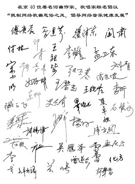 中國(guó)音樂(lè)家協(xié)會(huì)19日在京召開(kāi)“抵制網(wǎng)絡(luò)歌曲惡俗之風(fēng)”座談會(huì),與會(huì)代表痛批了以《那一夜》、《大連站》、《狼愛(ài)上羊》等為代表的網(wǎng)絡(luò)歌曲低俗化現(xiàn)象,同時(shí),以閻肅等為代表的在京40位著名詞曲作家、歌唱家聯(lián)名發(fā)起了“抵制網(wǎng)絡(luò)歌曲惡俗之風(fēng),倡導(dǎo)網(wǎng)絡(luò)音樂(lè)健康發(fā)展”倡議書(shū)。