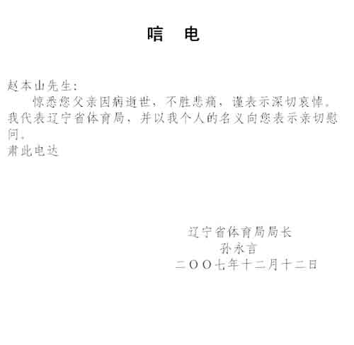 驚悉您父親因病逝世,不勝悲痛,謹表示深切哀悼。我代表遼寧省體育局,并以我個人的名義向您表示親切慰問。