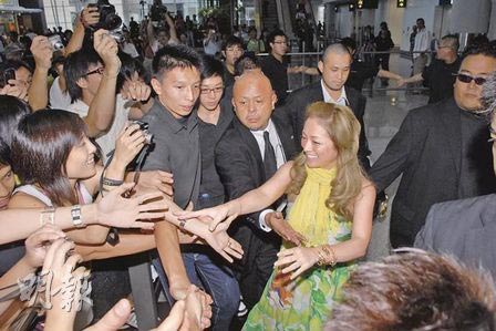 據香港《明報》報道,濱崎步昨午1時30分自日本抵港,一身古銅色皮膚的她穿著低胸綠色長裙,圍著黃色絲巾,見到半百歌迷迎接心情大好。香港唱片公司聘請30名保安護送,她本身日本貼身保安亦有6、7名。