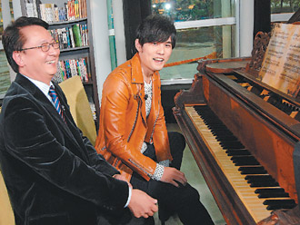 周杰倫(右)現場用鋼琴表演創作,令主持人李四端十分佩服。