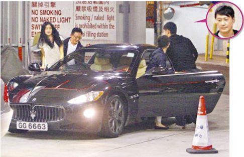 樂基兒(左)昨駕著黎明送她的跑車到加油站加油,他(右)則坐后座當乘客。