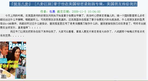 記者近日在國內最大的天涯論壇“娛樂八卦”版上看到,有網友貼出“美國雜志報道章子怡要發片的頭版消息”的帖子,帖子內容透露,“章子怡將出首張專輯,還請來了老友公司旗下的5位型男組合A-ONE做伴,曲風方面則有麥當娜親自制作,據說現在已經在錄音了,明年年出就要在全球發行。”