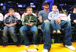 前日,貝克漢姆和湯姆·克魯斯(靚湯)兩家人感恩節后再度帶著他們的全部兒女露面。靚湯和小貝顯露出了他們做父親的不同方式。貝克漢姆(上圖)帶兒子去看NBA,抱著2歲的克魯茲,旁邊坐著6歲的羅密歐和9歲的布魯克林。