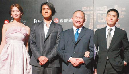 《赤壁》臺灣首映,林志玲(左起)、金城武、吳宇森和梁朝偉。