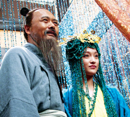 宮殿內(nèi),周潤(rùn)發(fā)扮演的長(zhǎng)須孔子跪在殿中,身著藍(lán)色華服、頭頂金色鳳冠、腳踏超高木屐、手執(zhí)羽毛蒲扇的“南子”周迅滿臉含笑,繞場(chǎng)一周端詳孔子,然后一膝跪下,口中念念有詞:“聽(tīng)說(shuō)夫子在魯國(guó)教書,有句‘窈窕淑女、君子好逑’,夫子可知否?”在得到肯定回答后,南子湊到孔子跟前,繼續(xù)“眉目傳情”:“不知詩(shī)三百里有多少男女之事?”“孔子”答曰:“詩(shī)三百,一言以蔽之,思無(wú)邪。”